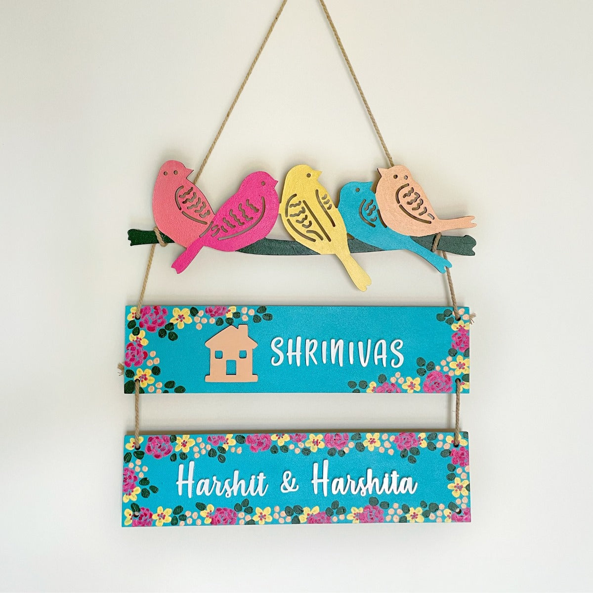 Featuring a row of colorful birds perched above vibrant hand-painted florals, this piece is perfect if you want to have 2 planks of text. Crafted with care and attention to detail, this unique piece is ideal for your front door, porch, or entryway. This comes with a connected thread for simple installation.